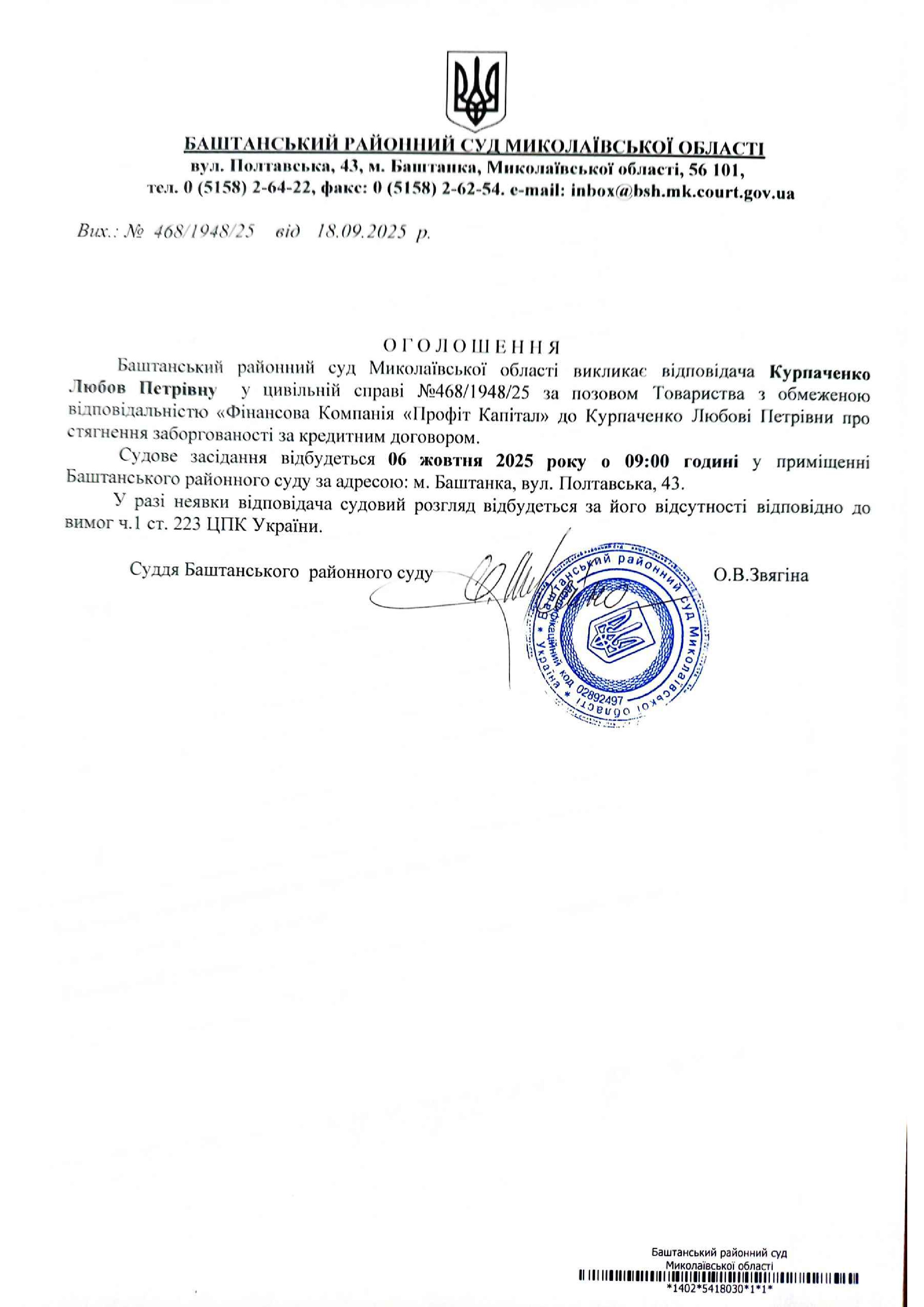 Оголошення про виклик до суду Курпаченко Л.П.