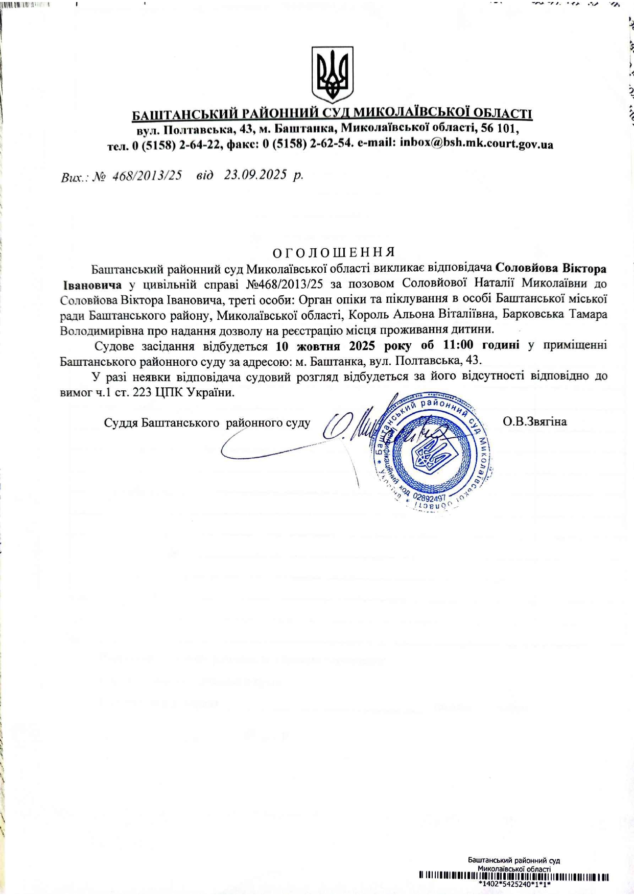 Оголошеня про виклик до суду Соловйова В.І.