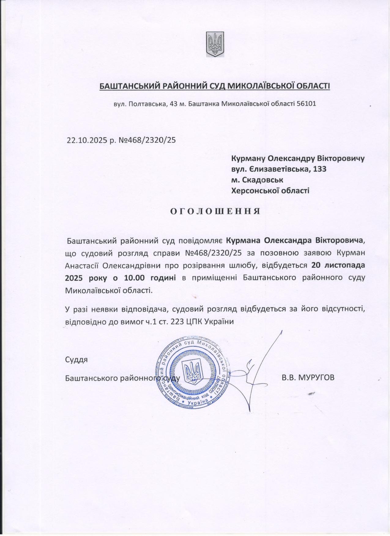 Оголошення про виклик до суду Курмана О.В.