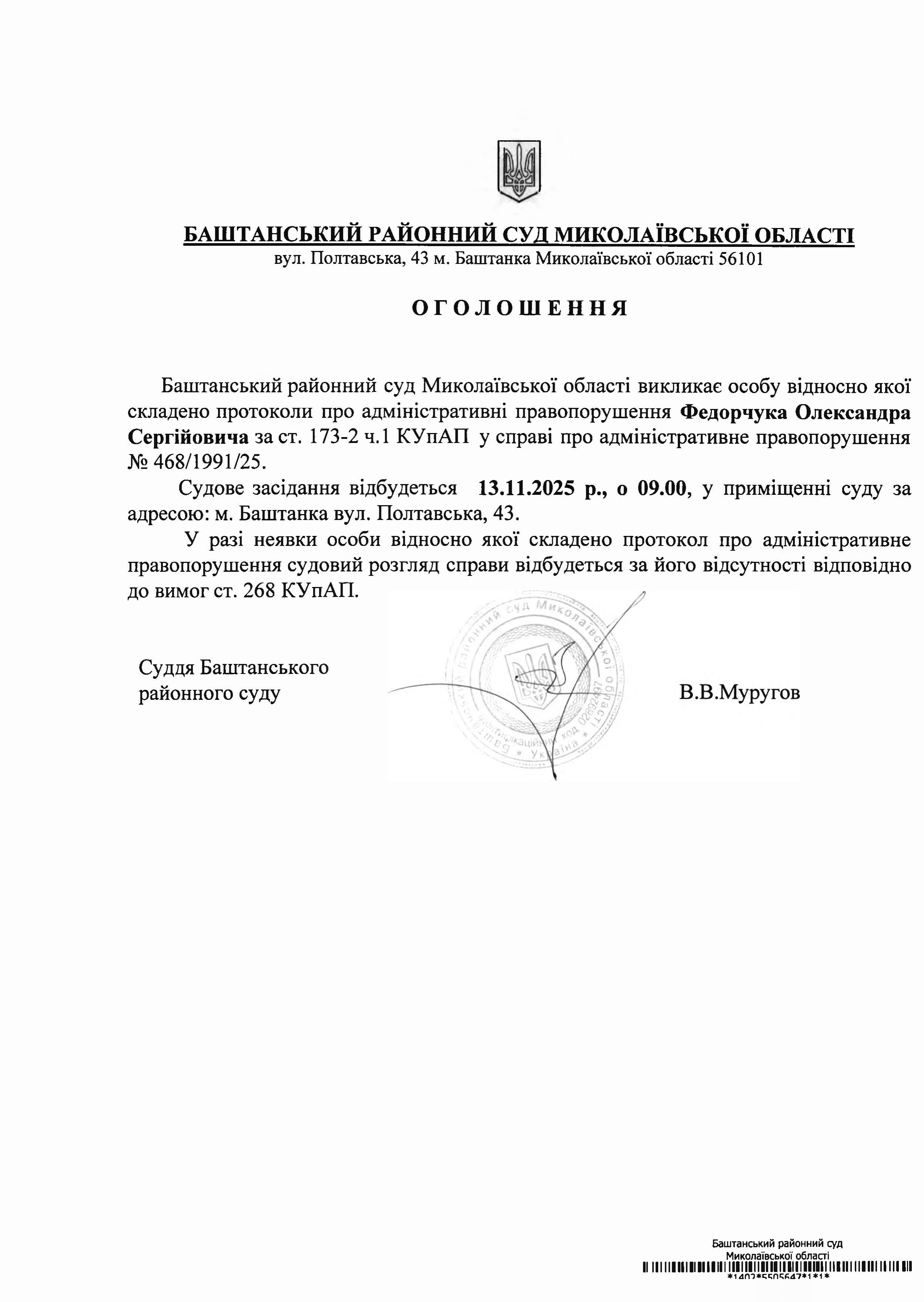 Оголошення про виклик до суду Федорчука О.С.