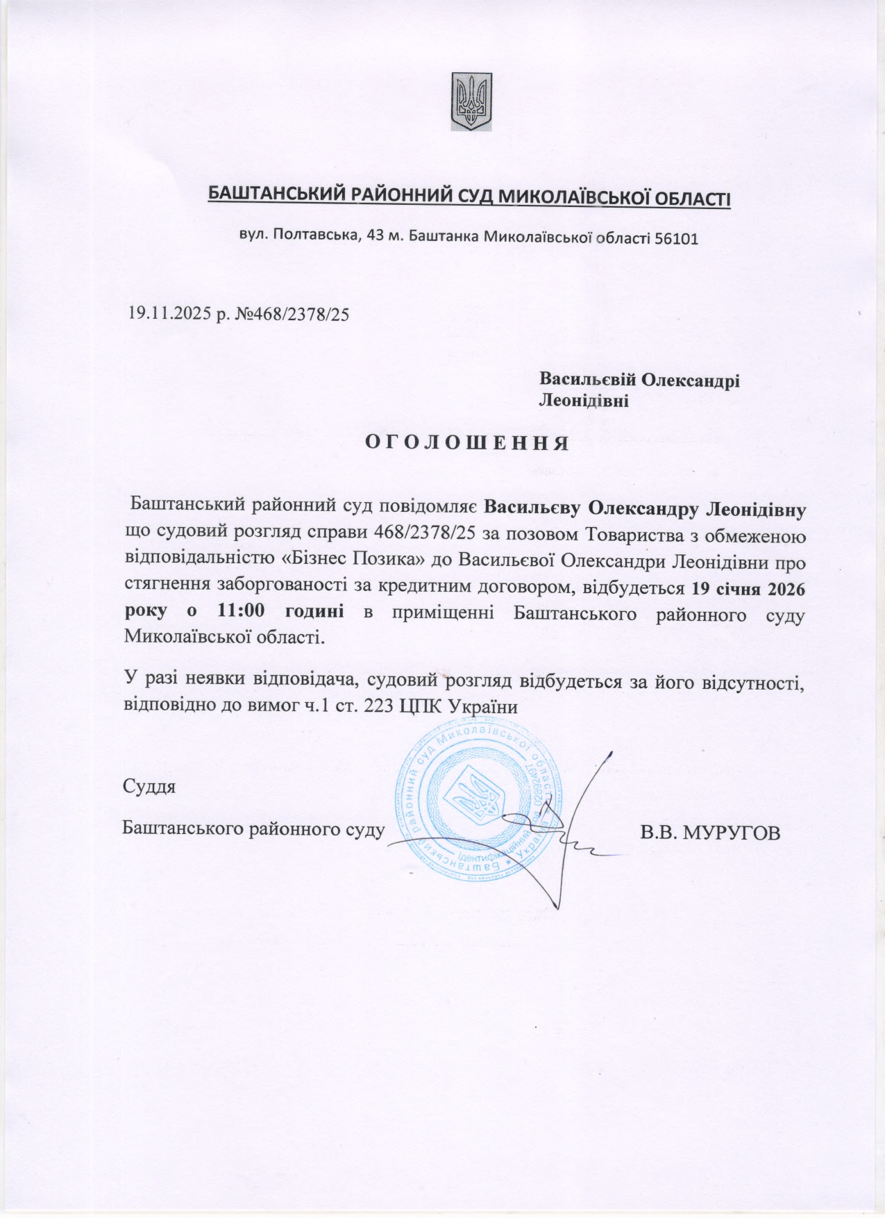 Оголошення про виклик до суду Васильєва О.Л.