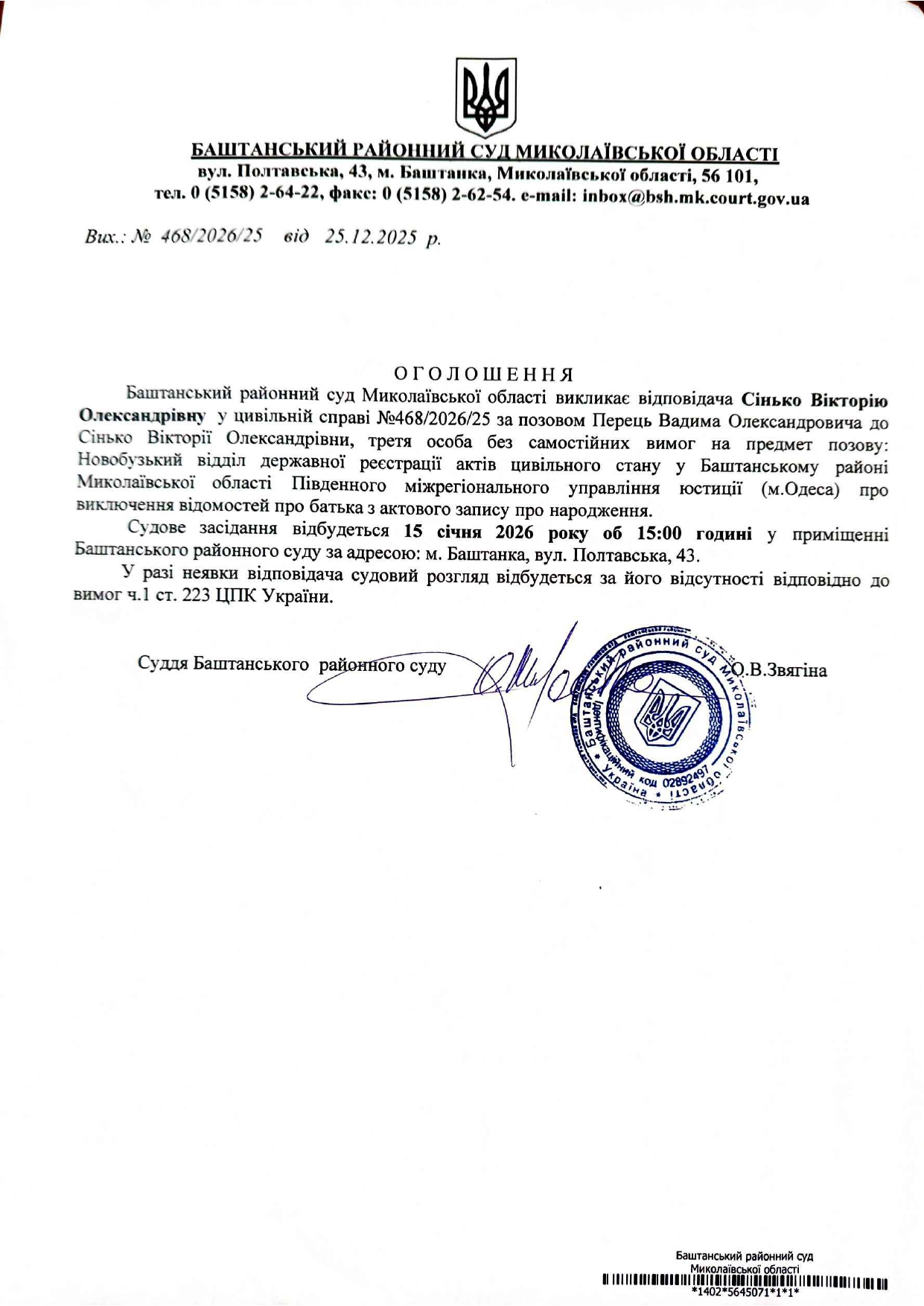 Оголошення про виклик до суду Сінько В.О.