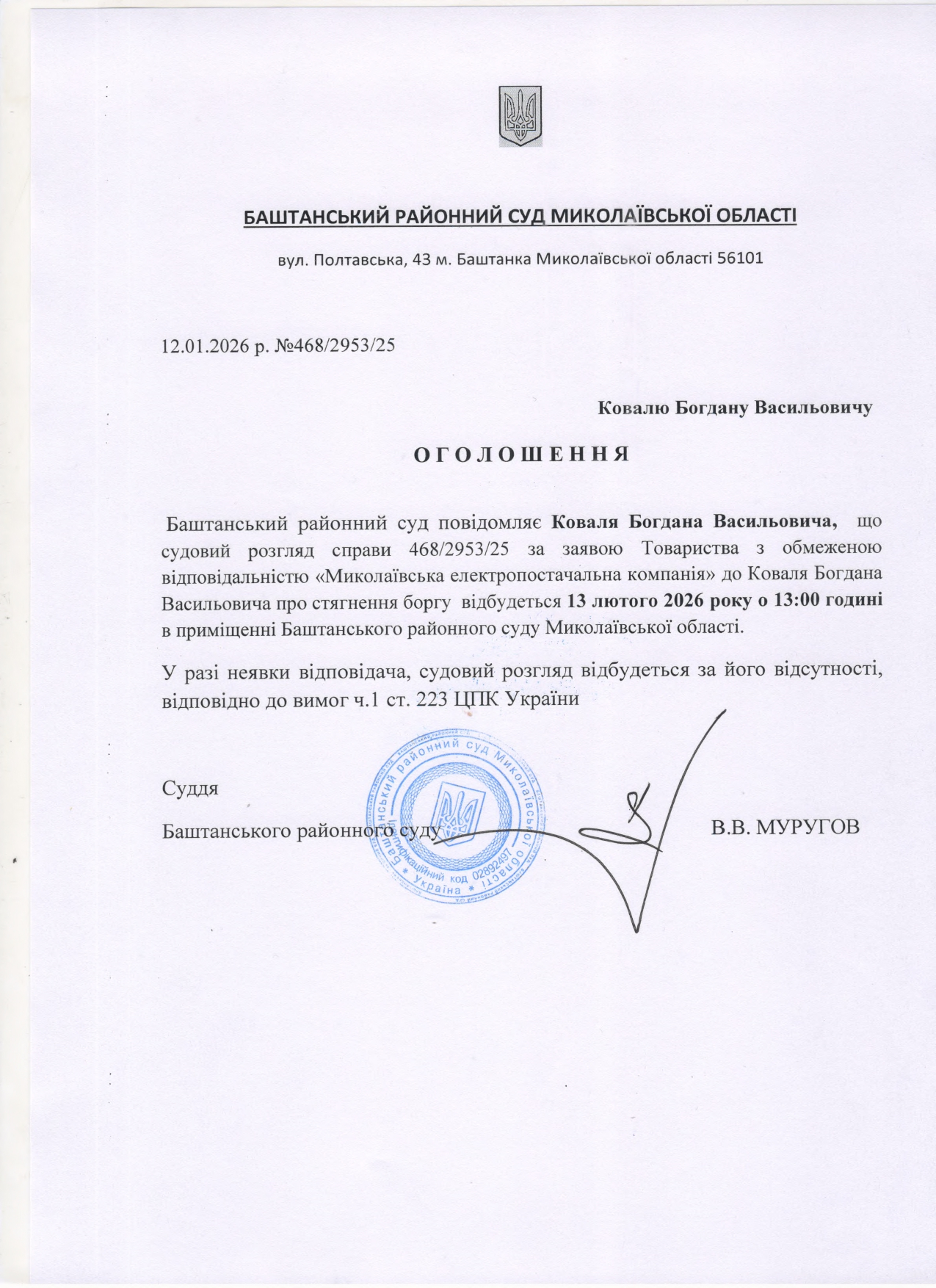 Оголошення про виклик до суду Коваля Б.В.