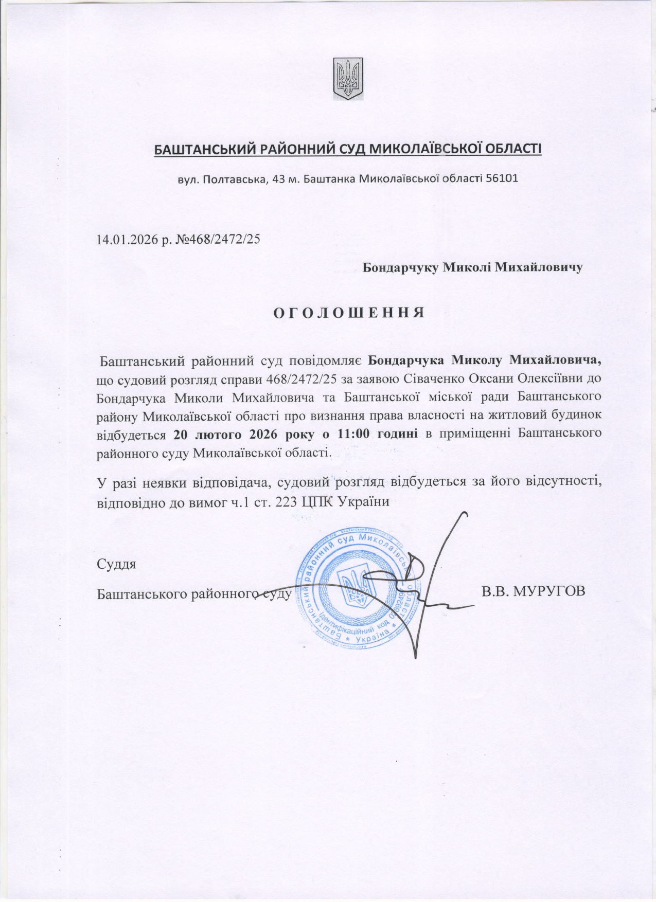 Оголошення про виклик до суду Бондарчука М.М.