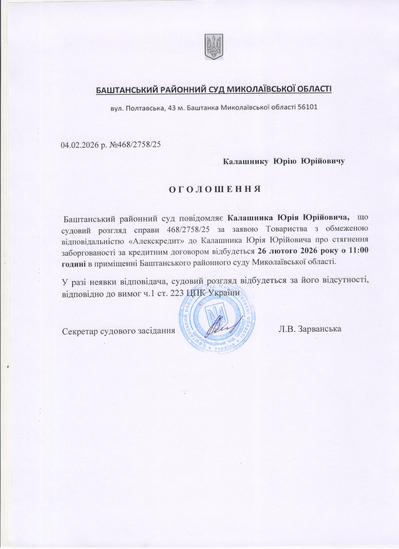 Оголошення про виклик до суду Калашника Ю.Ю.