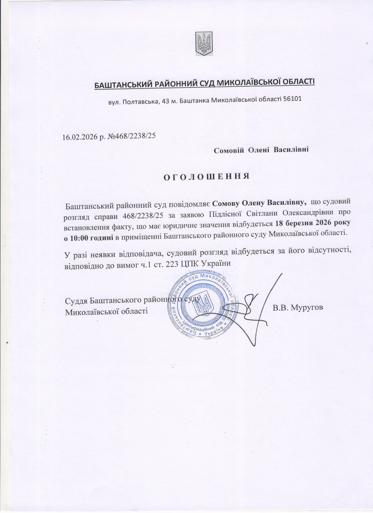Оголошення про виклик до суду Смолову О.В.