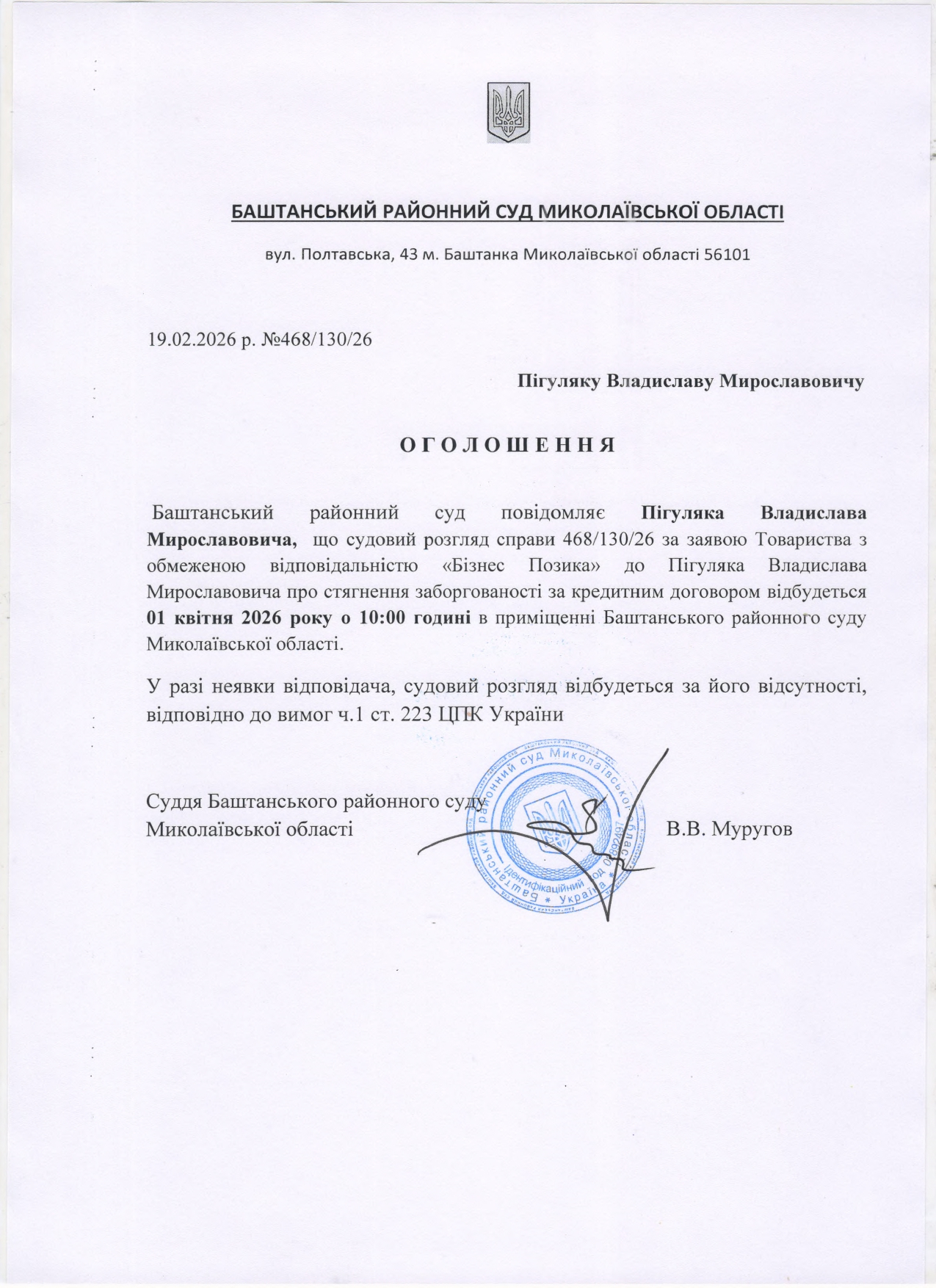 Оголошення про виклик до суду Пігуляка В.М.