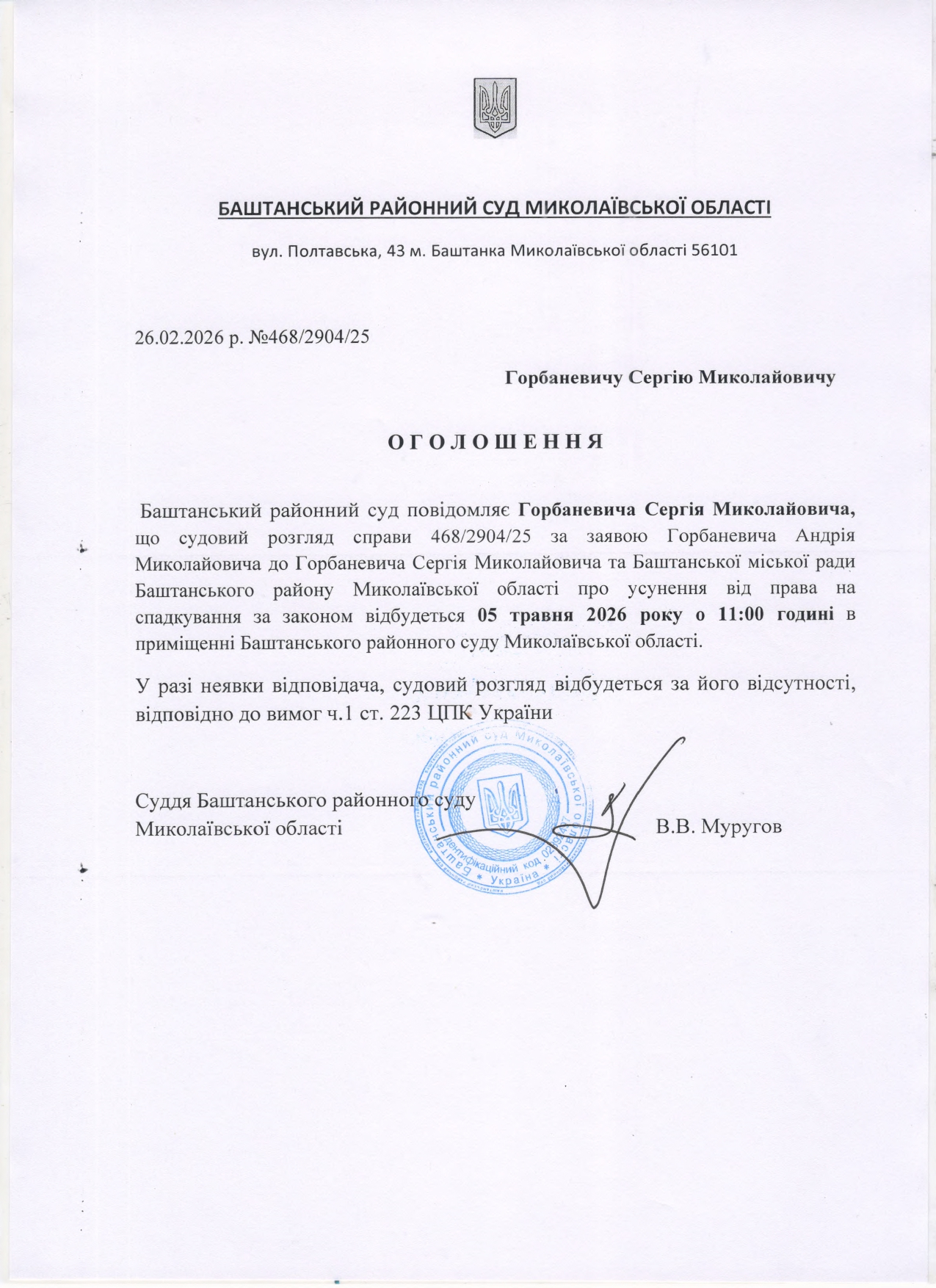 Оголошення про виклик до суду Горбаневича С.М.